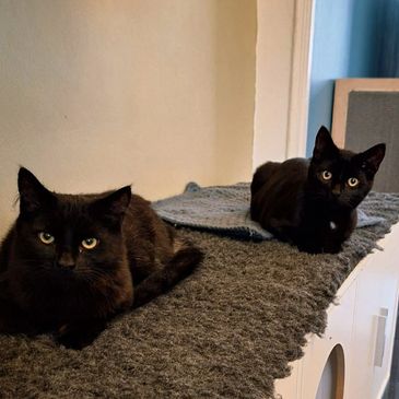 Boo (majestic fluffy black with a grey stomach and tail) and Jack (all black with a white tickle spot) are a pair of very sweetly bonded young brothers.