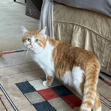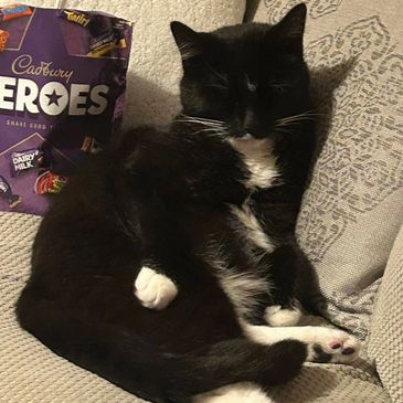 Hooch is a hunk a chunk at 6.45kg! He’s a lovely friendly cat who loves tummy rubs, cuddles and playtime! Although he's not a lap-cat at the moment, he does like to be picked up. He can be found watching tv/playing cat tv on the iPad, drinking from the toilet or hiding in the bath ready to jump out on you! He's not a fan of closed doors, or bells & plastic. He needs to be fed before bed otherwise he’ll let you know he’s hungry by jumping on you and meowing in the middle of the night!